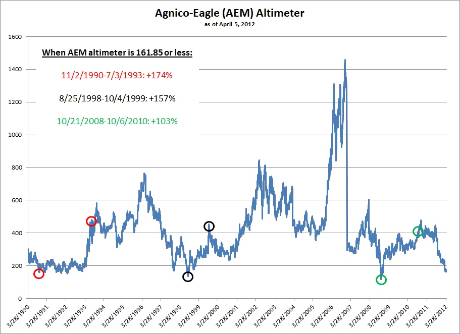 In our assessment of Agnico-Eagle, we have compared the current level of the Altimeter at 161.85 and compared it to other times when Agnico-Eagle has trade at the same relative level, or below, and traded up to 400 on the indicator. In the case of Agnico-Eagle there were two periods, before the bull market in gold stocks began, that the stock was selling at a low and was a great buy (based on the altimeter). In the period from November 2, 1990 to July 3, 1993, Agnico-Eagle rose +174% and in the period from August 25, 1998 to October 4, 1999 rose +157%.