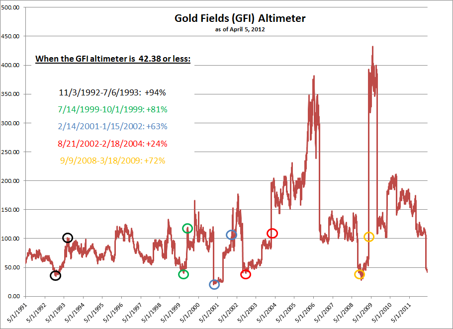 Presently, Gold Fields is trading at the Altimeter level of 42.38. The chart depicts the times when GFI was bought at the 42.38 level and sold whenever the Altimeter reached 100. The results are amazing and provide clear evidence on how gold stocks can outperform the price of gold when combining Edson Gould’s Altimeter with our Gold Stock Indicator.