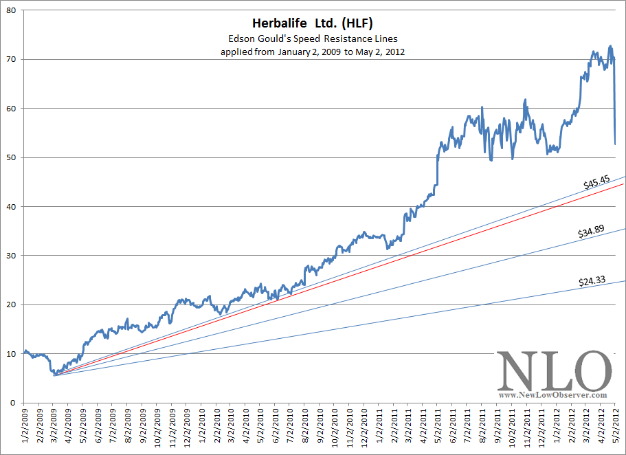After the news of Herbalife (HLF) getting slammed, we were curious about what the downside targets for the stock might be using Edson Gould’s Speed Resistance Lines. Below is a chart representing the conservative downside target of $45.45 and the extreme downside target of $24.33.