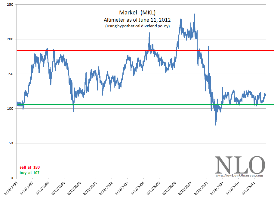 We have constructed an Altimeter for Markel (MKL) that is based on a hypothetical dividend assuming an average payout from earnings of 13% and a compounded annual growth rate (CAGR) of the dividend at 9.9%.