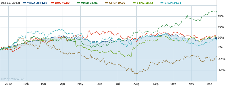 In our ongoing review of the Nasdaq 100 Watch List, we have taken the stocks from our list of December 16, 2011 (found here) and have checked their performance one year later. The companies on that list are provided below with the closing prices from December 16, 2011 to December 12, 2012.