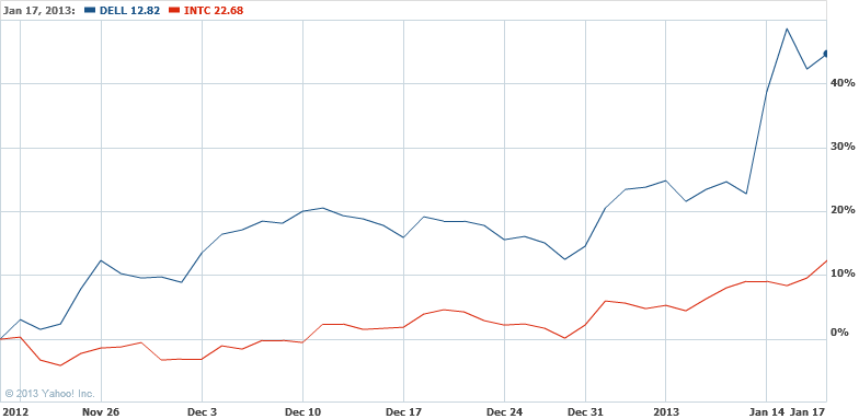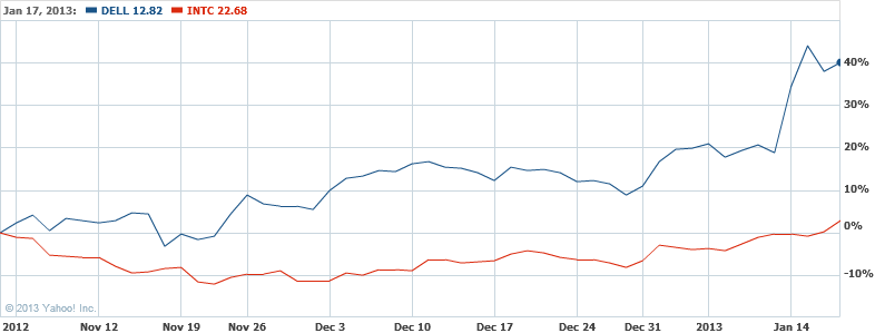 The price action between DELL and INTC since November 16, 2012 is charted below (based on the closing price of January 17, 2013):