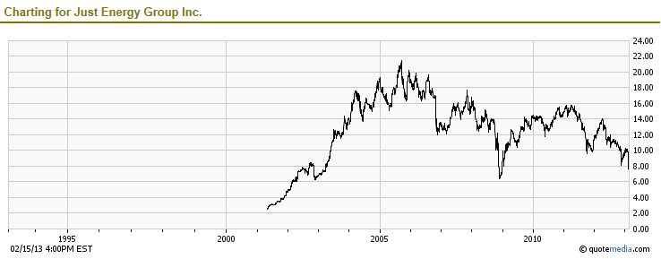 On the technical front, Just Energy is fast approaching the 2009 low of $6.60 after breaking below the November 2012 low of $8.00. There appears to be tremendous technical support at the $6.00 level going all the way back to 2003. If you’re interested in this stock, consideration of purchases of Just Energy should be entered into in three phases, once at $6.60, $6.00 and $4.00. Naturally, breaking below $6.00 on the downside suggests that the floor’s the limit.