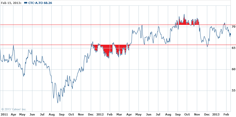 Another company of interest to us is Canadian Tire Corp. (CTC-A.TO). According to Yahoo!Finance, Canadian Tire, “…offers a range of products and services through retail brands and banners in Canada. The company retails shopped general merchandise through a network of 488 Canadian Tire stores, which provide auto parts and accessories, sports and leisure products, and home products operated by independent third-party operators.”