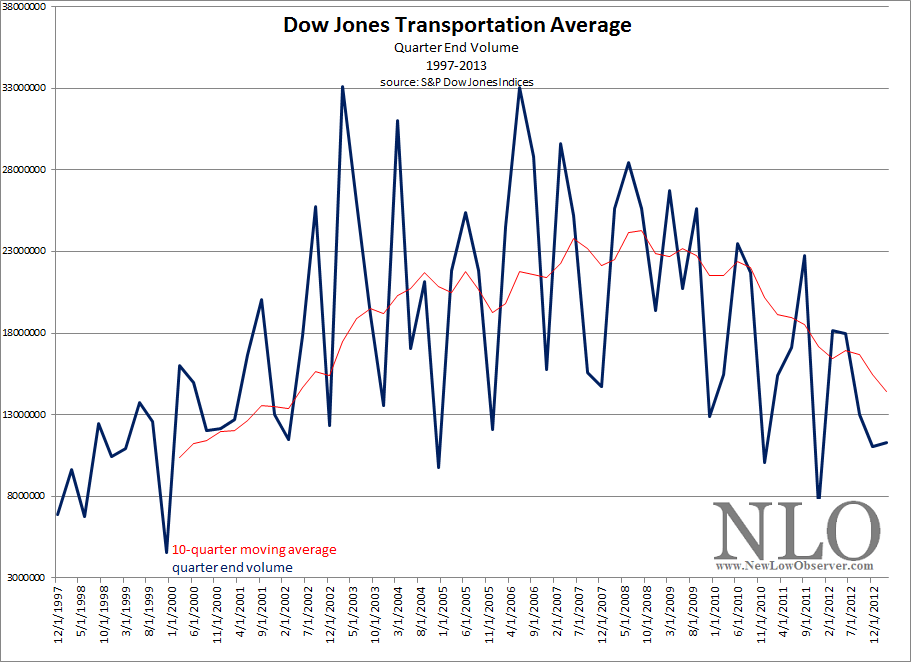 The average trading volume for the Industrials and Transports has been in a declining trend (contracting) since the 2009 low, as seen in the charts below.