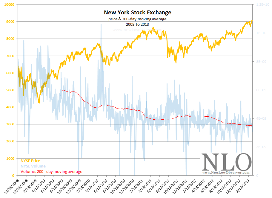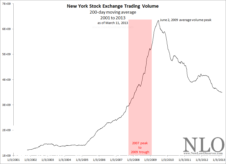 In the chart from 2001, we can see that NYSE average trading volume hit a peak in 2002 and then flat-lined for a couple of years until 2005. However, as the strength in the stock market grew, the trading volume accelerated to new highs. This was the hallmark of a true bull market run, rising prices and rising volume.