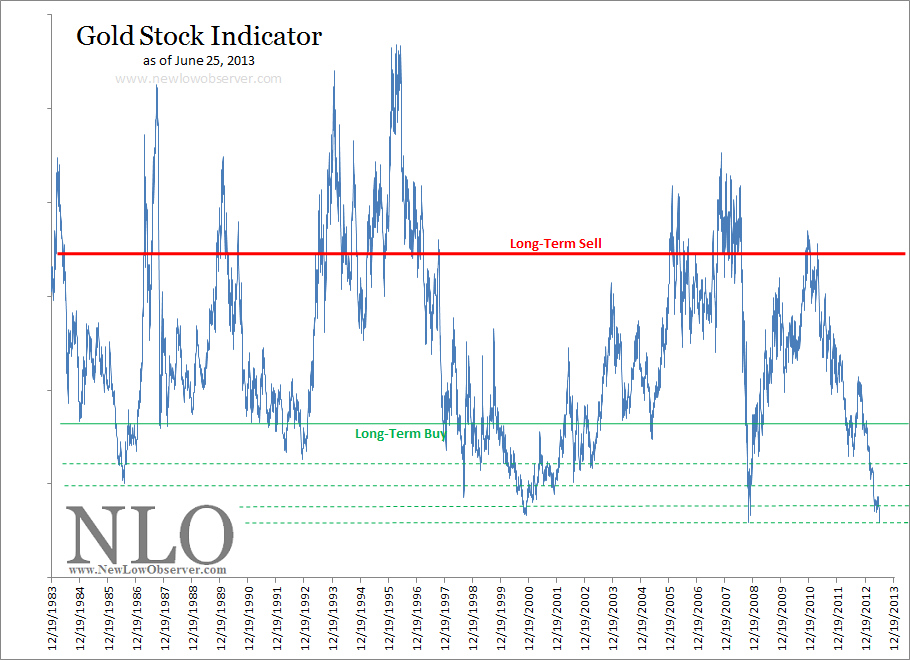On June 24, 2013, the Gold Stock Indicator (GSI) declined below the 2008 low for a brief moment. Today, June 25, 2013, the GSI is at the 2008 low.