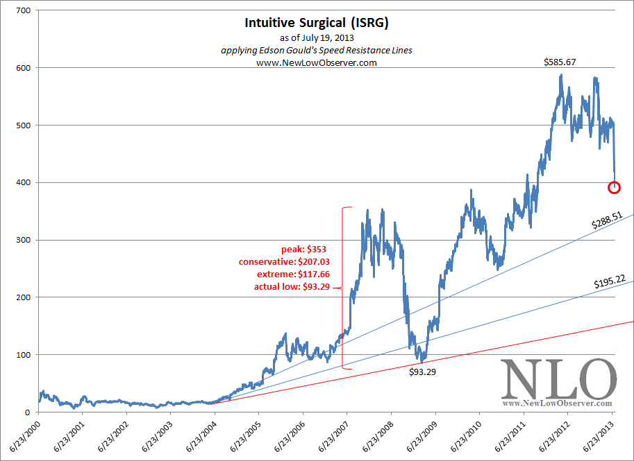 With the recent decline in the price of Intuitive Surgical (ISRG) and the fact that it is showing up on our most recent Nasdaq 100 Watch List (found here), we’d like to see what the downside prospects are for the stock based Edson Gould’s Speed Resistance Lines. Below is a chart of the expected conservative and extreme downside targets.