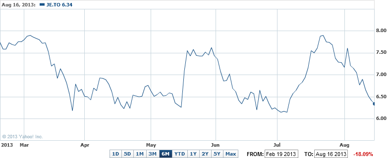 On this week’s list is Just Energy (JE.TO). As a review, Just Energy was on our February 18, 2013 Canadian Watch List at $7.56. We had projected that the $6 level had significant support (found here). By late March 2013, on an intra-day basis, JE.TO traded as low as $5.89. Afterwards, JE.TO traded close to $8 a share by mid-July 2013. On July 31, 2013, we recommended that investors sell the principal of gains made in JE.TO (found here). Since that sell recommendation, JE.TO has declined –13%. Because JE.TO is trending lower, we recommend reassessing the stock when and if it declines to the $6.15 level. The dividend for JE.TO should not be a consideration for this stock as there are continued risks to the dividend going forward.