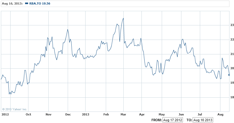 RBA.TO managed to fall to $17.84 on an intra-day basis on August 30, 2012. Afterwards, RBA.TO rose as much as +24%, assuming a purchase of the stock at $19/share. In addition, 2012 wasn’t the only run-in with RBA.TO. On August 22, 2010, Ritchie Brothers appeared among our top 5 stocks on the watch list when it was trading at $18.94 (found here). We’re giving investors the same advice as we had in last year’s remarks: