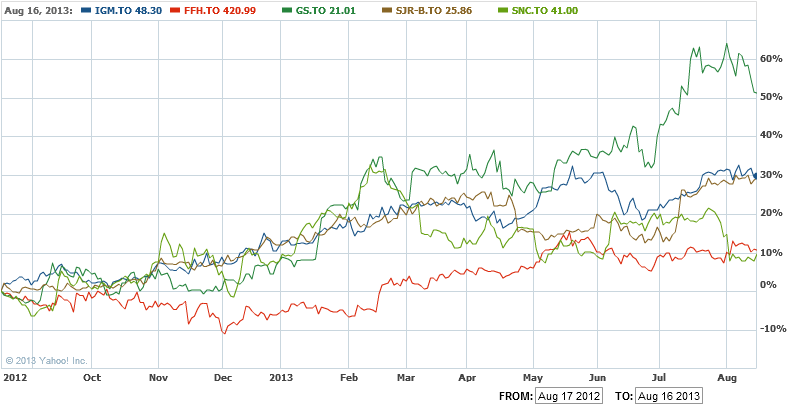 The top five stocks smashed the performance of the Toronto Stock Exchange of the same 1-year period by 5 times. The worst performing stock, SNC-Lavalin Group (SNC.TO), with a gain of +9.60% was almost double that of the TSX. But don’t let the year-end totals fool you, SNC.TO had gains of over +30% by February 2013 for an annualized return of over +60%. The stock that truly underperformed all year was Fairfax Financial (FFH.TO)with a gain of +10.08% being near the high end of the one year range.