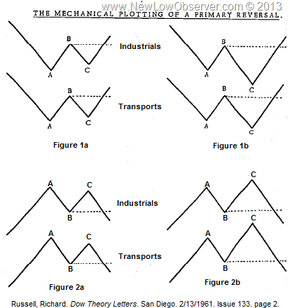 "In figure 1b we see a more unusual formation and one which is in many ways less satisfactory. Nevertheless, Rhea accepted the formation in Figure 1b as implying a change in the primary direction. On the decline to A, ‘bear market lows are recorded. An upward reaction ensues (A -B), followed by a further decline which takes both Averages to new bear market lows at C. At C there is little to suggest that the primary trend has turned (except, perhaps, for a drastic diminution in volume). Subsequent to the C lows both Averages turn up and advance steadily (with little or no correction). At the point where the preceding secondary high (B) are bettered by both Averages the primary trend is considered to have changed from bear to bull." (source: Russell, Richard. Dow Theory Letters. February 13, 1961. Issue 133. page 2.)