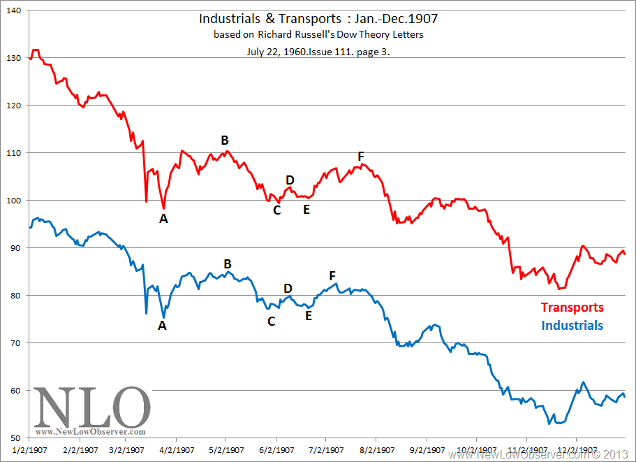 "COMPARISONS. A study of the history of the price movement suggests that the more times an important point has been 'tested' (approached but not violated), the more drastic the resultant move if and when that point is penetrated. The accompanying chart traces the pattern of the Averages throughout the year 1907. Because of the similarities in the price movement then and now, I feel that the 1907 period is well worth studying. Following a sharp decline which began in late 1906, both Averages touched lows in March, 1907 (A on chart). From there a rally extended into early May (B). In mid-May the two Averages declined to test the previous March lows (C), then rallied to point D. From D another decline (to E) served to retest the earlier C levels. When the C levels again held, the advance to F was sparked.
