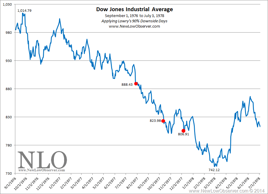 The result of our narrow interpretation of the data indicates that the average decline of the market, by the time of the first 90% Downside Day, was -48% of the total expected decline. As an example, below is a chart of the Dow Jones Industrial Average from September 1976 to July 1978. In the period of time from the prior peak on September 21, 1976 to the low on February 28, 1978 there were three instances of 90% Downside Days occurring on July 27, 1977, October 12, 1977 and December 6, 1977 (red dots).