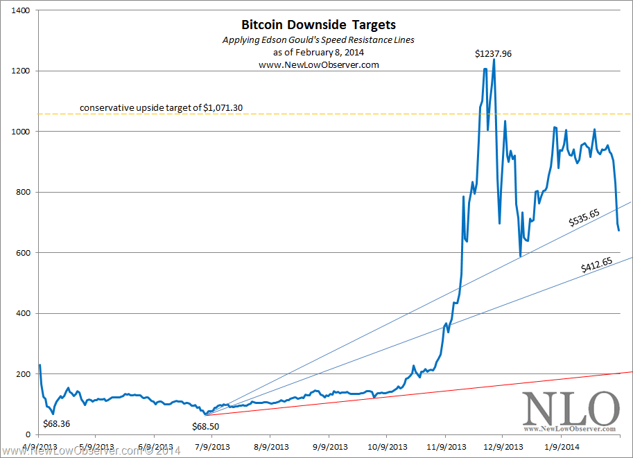 In the last few days, Bitcoin has experienced extreme volatility in its price when it fell -32.7% from the intermediate peak experienced on January 5, 2014 at $1,015. We’re now faced with the potential for Bitcoin to achieve the ascending downside target of $412.65 (now at approximately $570) followed by the worst case level of $200 (ascending red line).