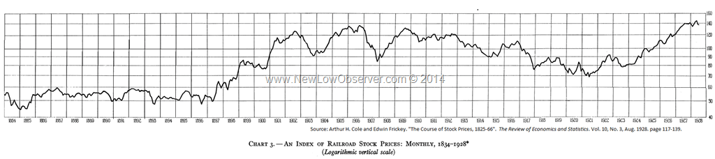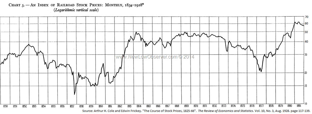 Arthur H. Cole and Edwin Frickey. “The Course of Stock Prices, 1825-66”. The Review of Economics and Statistics. Vol. 10, No. 3, August 1928. page 117-139.