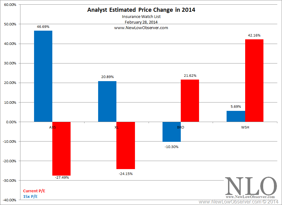 Below is a snapshot of the analysts low estimated earnings assuming a price-to-earnings ratio of 15 in blue and the estimated price change if the current P/E were to remain the same for the remainder of 2014 in red and the percentage change in price that is implied based on these estimates.