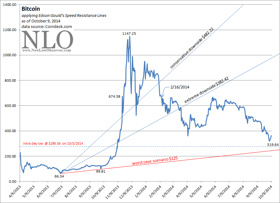 In an attempt to demonstrate the difference between Gould’s downside SRLs, if we had estimated the downside targets for bitcoin based on the Coindesk.com average instead of Mt. Gox numbers dated November 19, 2013, we would have come up with the following downside targets: