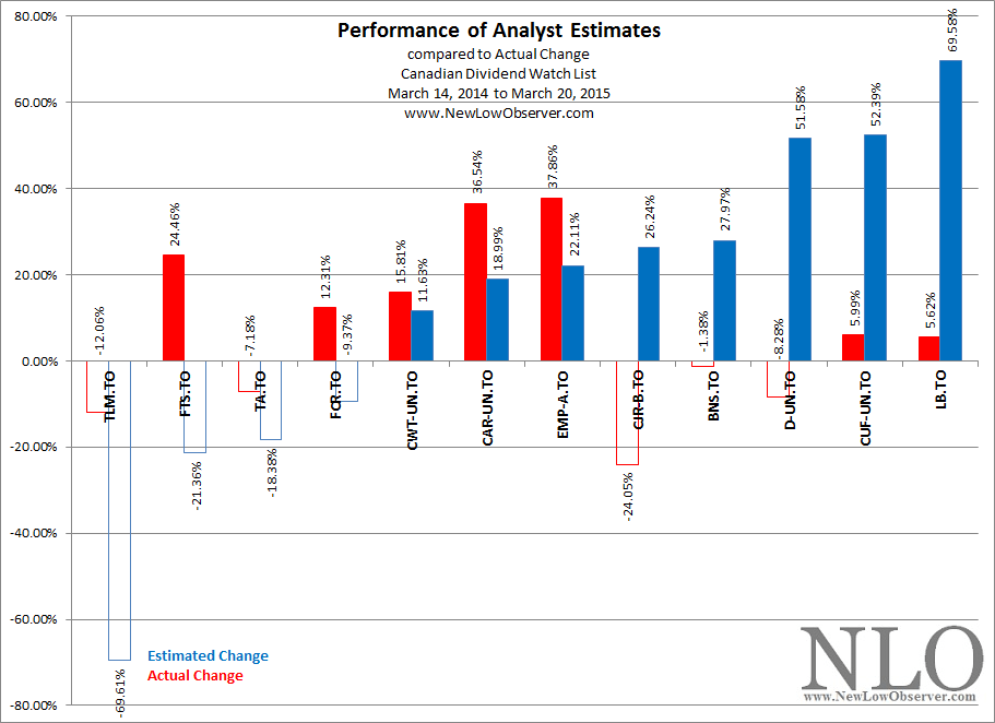 As is frequently the case, the analyst estimates did not quite match the actual performance with the exception of CWT-UN.TO, CAR-UN.TO and EMP-A.TO.