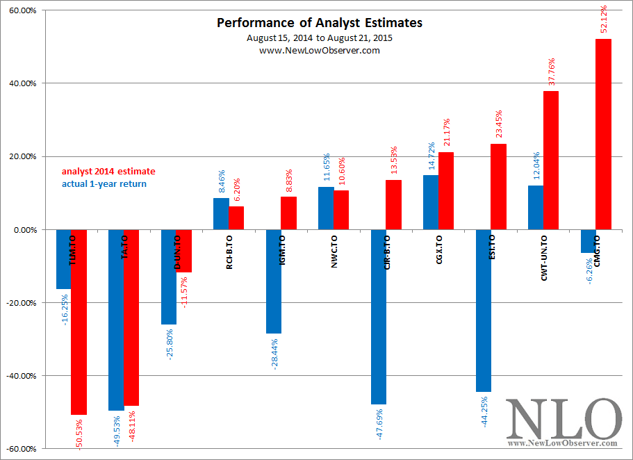 The entire list lost –15.58% which is compared to the Toronto Stock Exchange decline of –12.16% in the period from August 15, 2014 to August 21, 2015. The top five stocks on our list averaged a loss of –19.08% which is substantially more than the index. Below we’ve outlined the performance of the watch list stocks compared to the analyst estimates.
