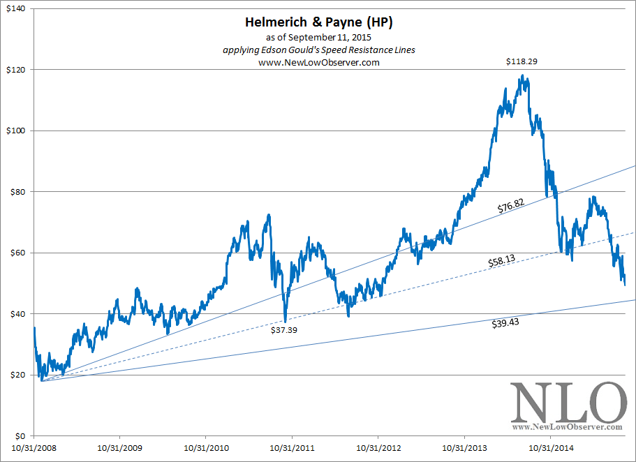 Based on the work of Edson Gould, Helmerich & Payne has declined below the conservative and midrange targets of $76.82 and $58.13, respectively. All that is left for the downside, on a technical, is the extreme downside target of $39.43.
