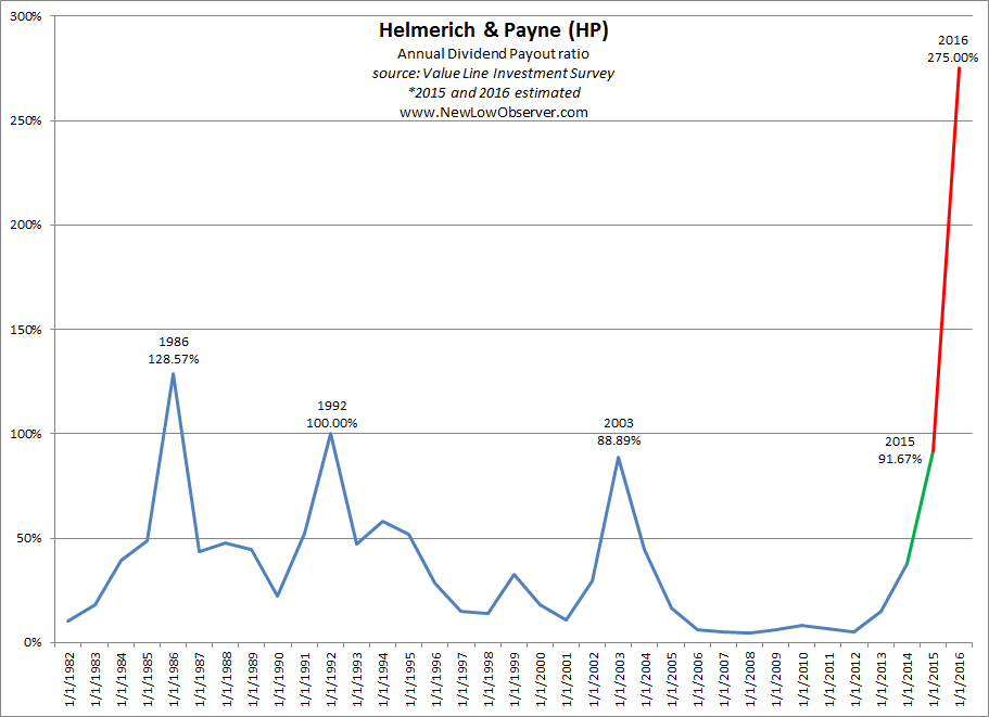 The dividend payout ratio is an decent indication of the best times to consider a stock. Whenever the dividend payout ratio exceeded 80% the price of Helmerich & Payne was at a relative low. Already, HP is at a payout ratio of 91.67% based on estimated 2015 earnings of $3.00 per share.