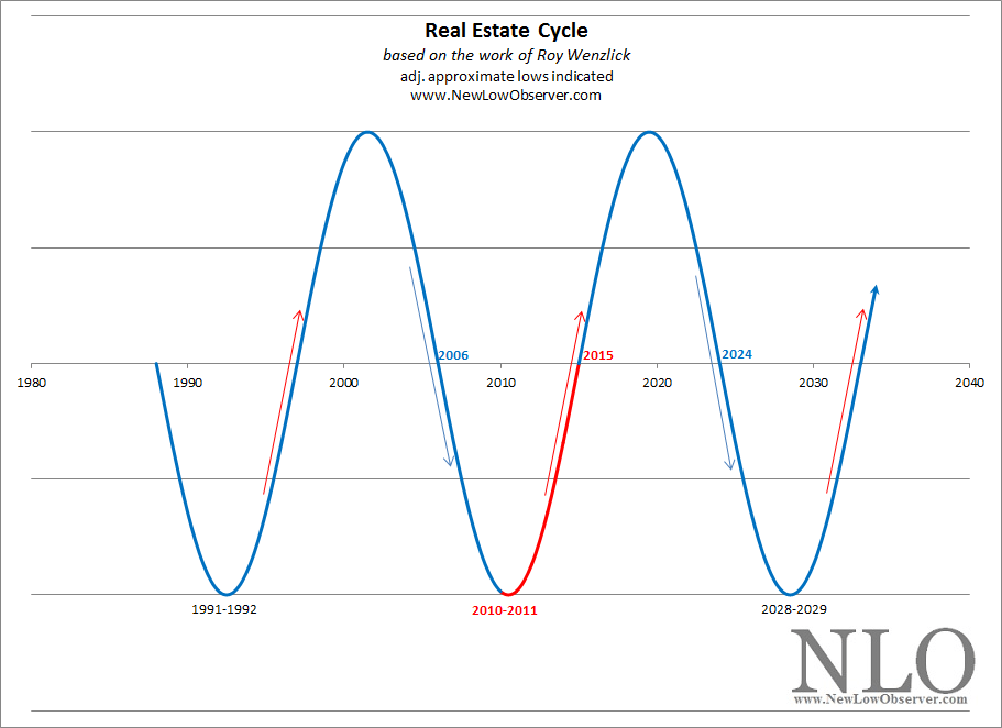 Below we’ve included a revised and adjusted chart of Roy Wenzlick’s cycle of real estate based on the low of 2010/2011.