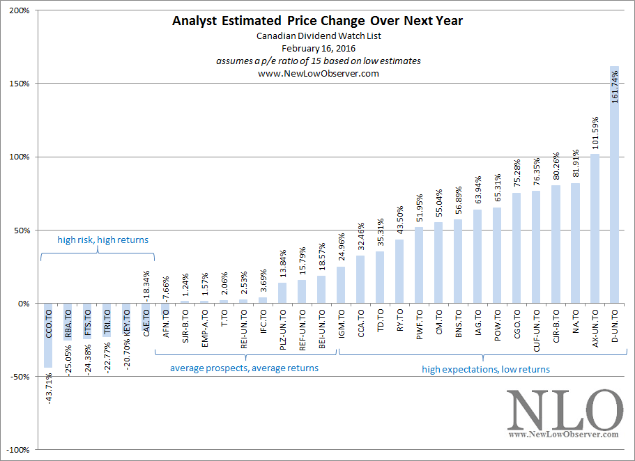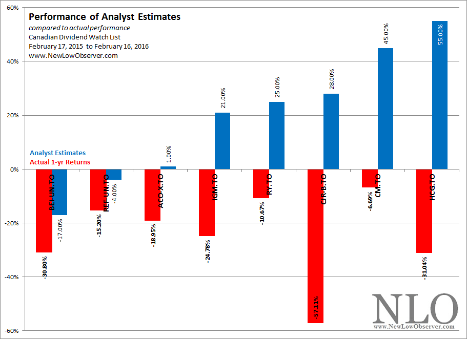 The analysts were off target for their 1-year projections. Only Canadian REIT (REF-UN.TO) and Boardwalk REIT (BEI-UN.TO) came close (somewhat) to the analyst targets.