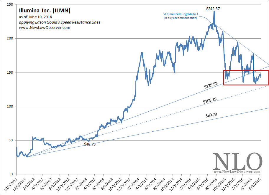 According to Value Line Investment Survey dated May 20, 2016, ILMN is fairly valued at $146 based on estimated 2016 cash flow and valued at $182 based on 2017 estimated cash flow. Previous tracking of ILMN suggests that the stock can trade as low as 30% below Value Line’s estimated fair value. However, this estimate of downside decline generally applies if you want to catch the “bottom”. Problem is, we’ve never been able to reliably predict the low.