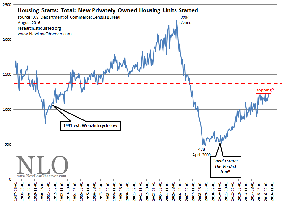 The latest trend from September 2015 to the present appears to show topping out action as the Housing Starts data seems to be running out of steam. Additionally, the dotted red line in the chart shows the Dow Theory halfway point at which either the market booms higher or stalls & stutters before declining substantially, relative to the most recent rise.