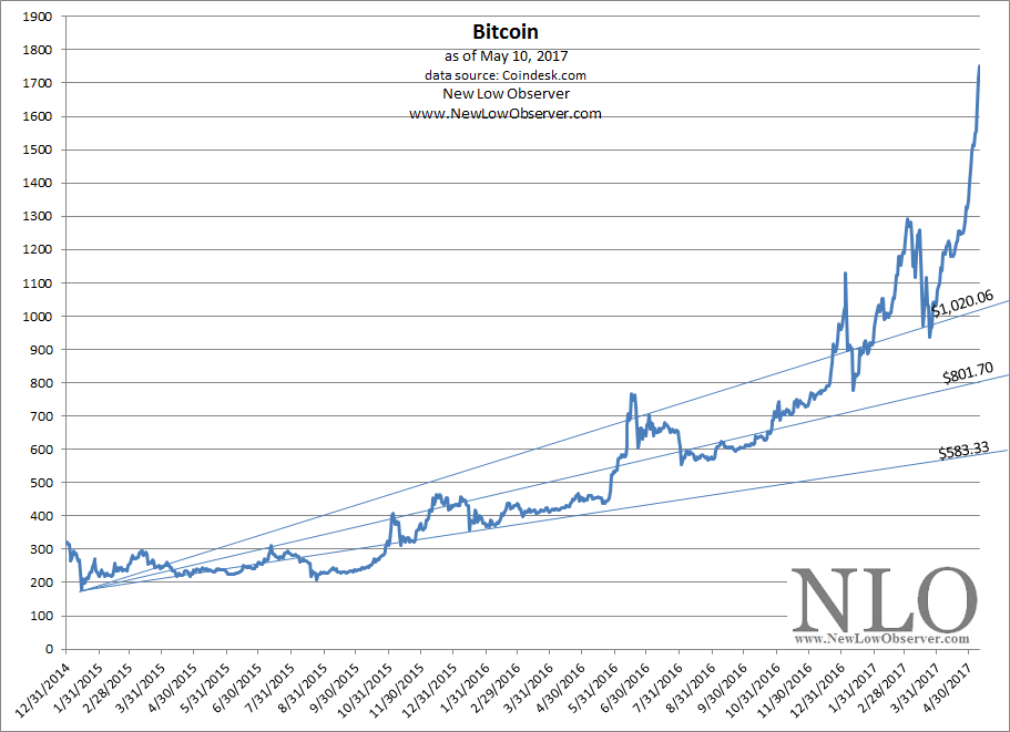 On May 10, 2017, Bitcoin has achieved a new high of $1,750. If this level can be sustained, we think that the extreme upside target of $2,316.35 is possible. However, we have to acknowledge the downside targets that come with a parabolic increase.