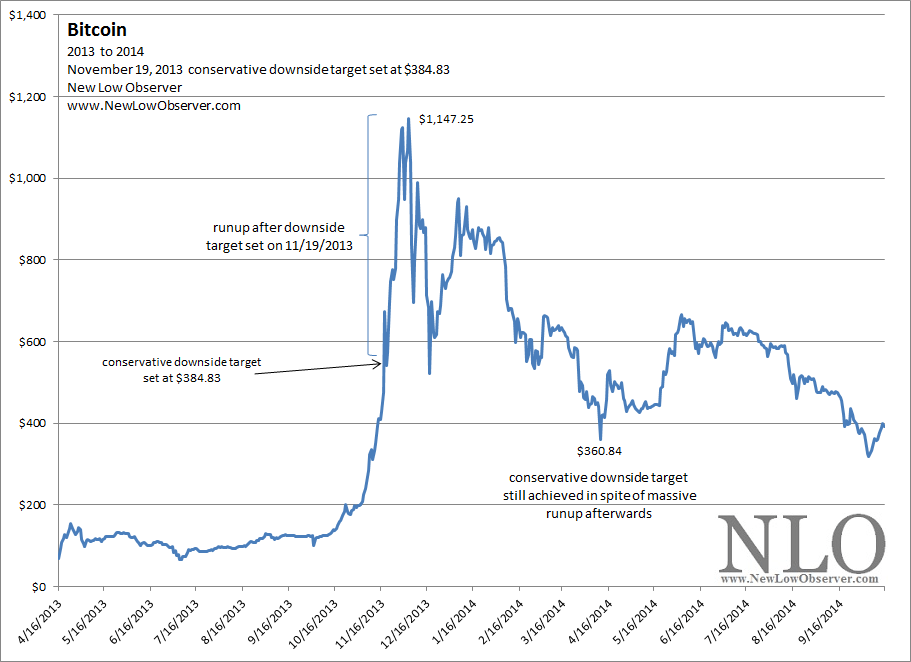 On November 19, 2013, after Bitcoin smashed to what we thought were amazing heights, we provided a conservative downside target of $384.83. Afterwards, Bitcoin jumped from above $600 to $1,147.25.