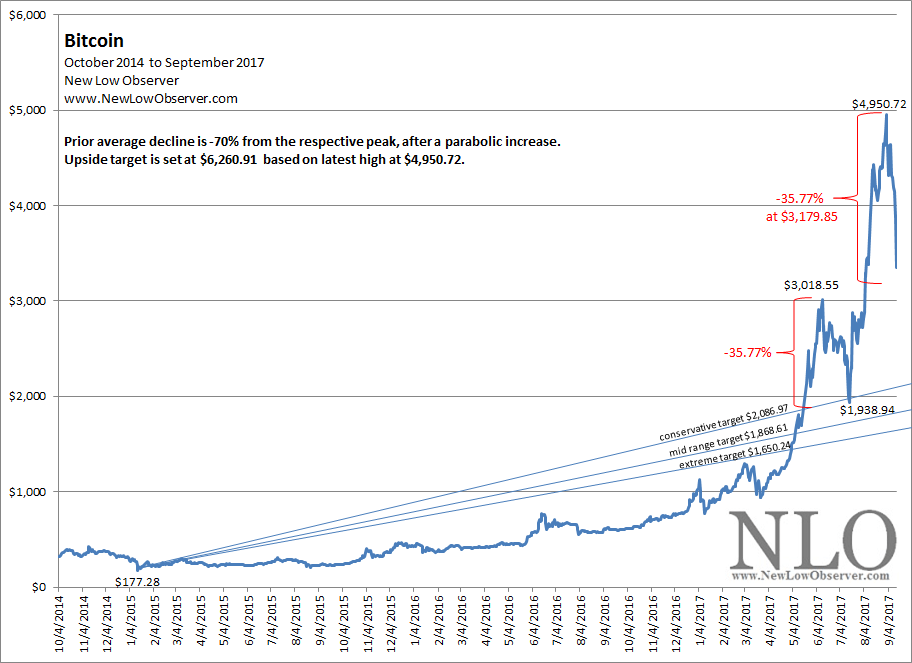 Bitcoin is going through the customary pullback in the price. The new threshold to watch for is –35.77% on the downside. This was the amount of loss that speculators and investors were willing to accept from the June 11, 2017 high of $3,018.55 to the July 16, 2017 low of $1,938.94 before a new bull run to the upside ensued. Most traditionalist say that a bear market starts at or near a decline of –20% or more. At which point, it takes some time before the “investment” gets back to the previous high (example: Nasdaq Composite took 15 years to get back to the 2000 high).