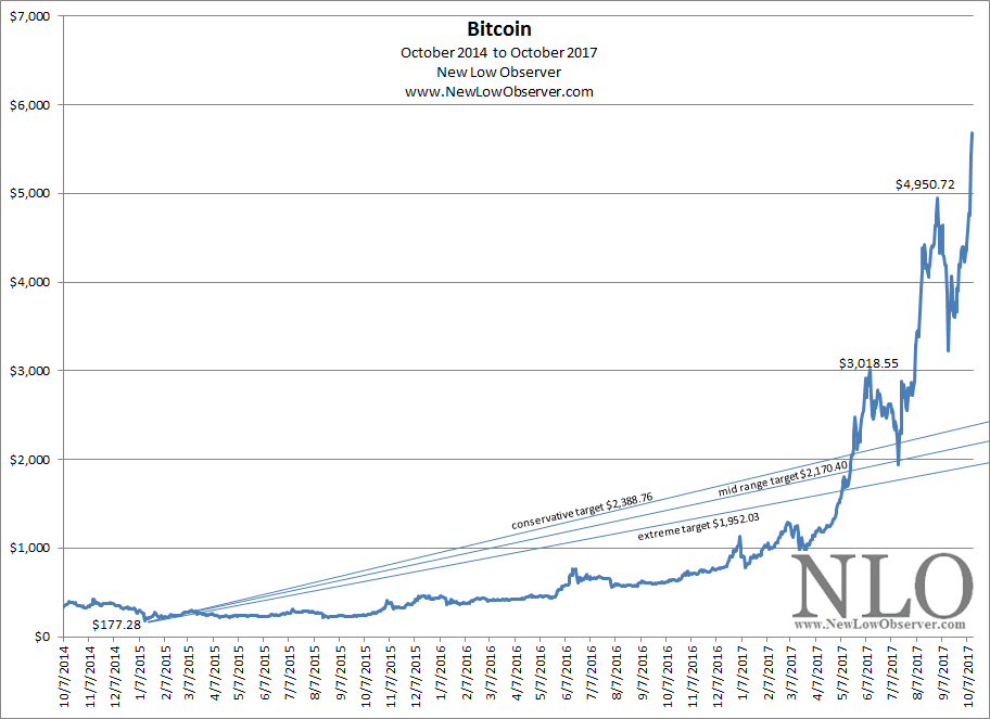 Since October 7, 2014, we have issued revised upside targets and downside targets that have been generally within the range of expectation. Our last published upside target for Bitcoin was $6,260.91 as seen in the September 5, 2017 posting titled “Bitcoin: Setting the Stage.” The graphical representation of the price of Bitcoin since October 7, 2014 is staggering and worth a refresher view.