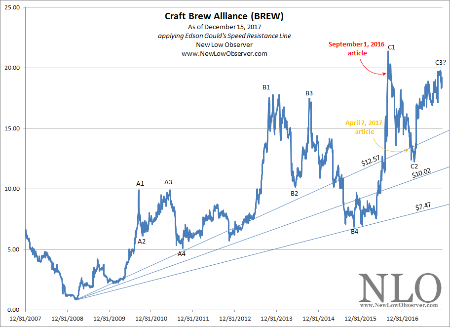 Since September 1, 2016, BREW declined as much as –38% to the $12 level on April 18, 2017, on an intraday basis. On April 7, 2017, we said the following: