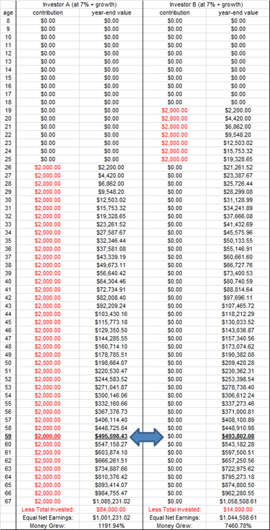 This is a lesson on compound interest. Look at the table below to see what happens when a person puts away $2,000 a year for 7 years ($14,000 in total) and nothing more after that compared to a person who puts away $2,000 a year in the 8th year and every year after that for 42 years ($84,000 in total).