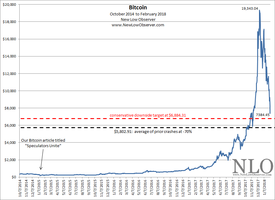 Since December 22, 2017, Bitcoin has had these downside targets. Worth noting is that the rise from the low to the December 2017 peak is equal to the 2011 low to the 2013 peak on a percentage basis. We’re within striking distance of the exact same percentage decline from the April 2013 peak to the July 2013 low.