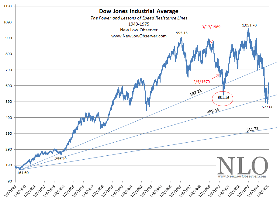 The amazing level of accuracy in the SRL at the time could have led to some errors on our part. The circled area that says 631.16 would have been where we would have consider buying stocks, as we would have thought the downside target had been achieved (close enough is ok with us). However, as seen in late 1974, the DJIA managed to go as low as 577.60 before the ultimate rise to the secular peak in the year 2000.