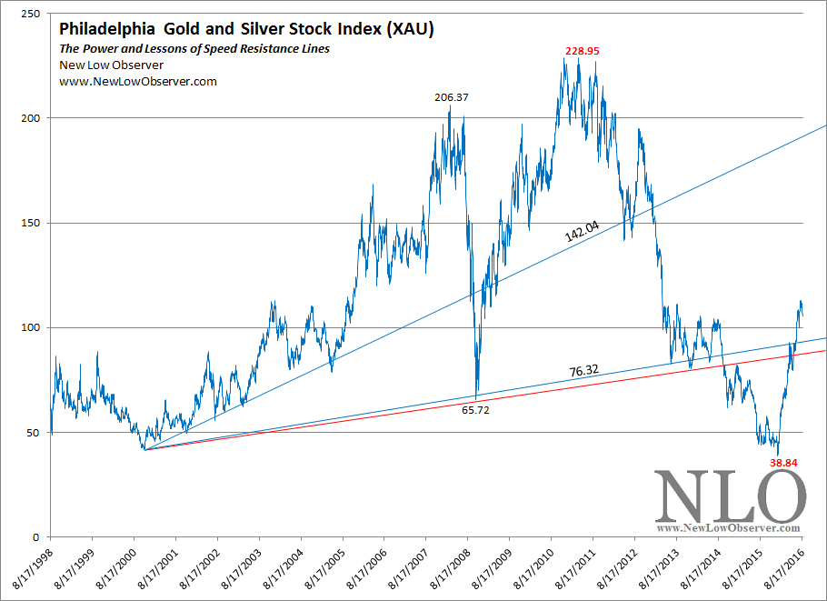 On April 14, 2011, when the Philadelphia Gold and Silver Stock Index (XAU) was at 219.18, we projected downside target of 76.32. This was when we were relatively unsure of how the SRL worked. Below is what the XAU did after that April 2011 posting.
