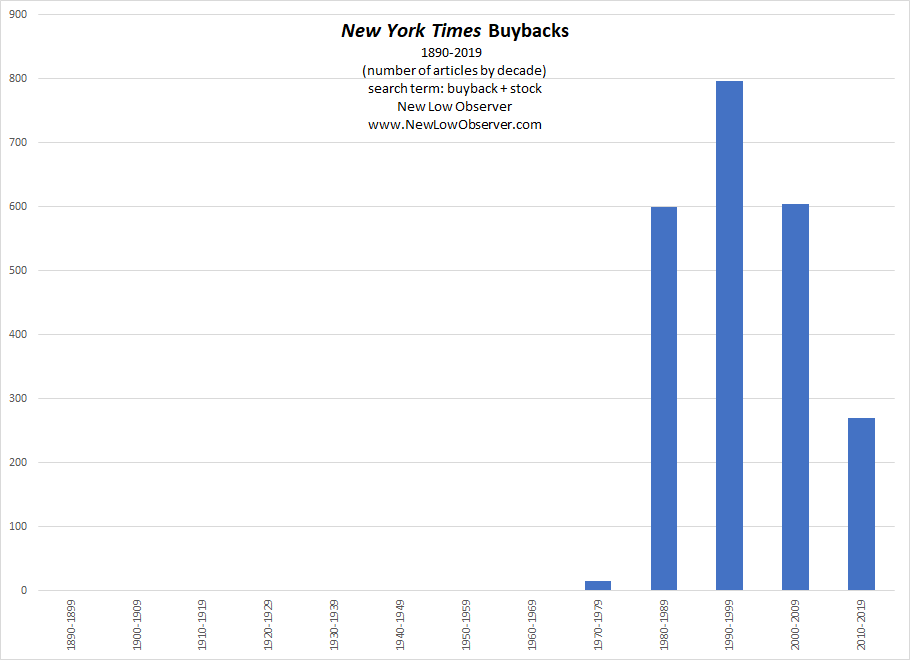 Although we’re not at the end of the decade, from 2010 to 2019, we have reviewed the number of New York Times articles on the topic of “buyback” and “stock” and compared it to prior decades.
