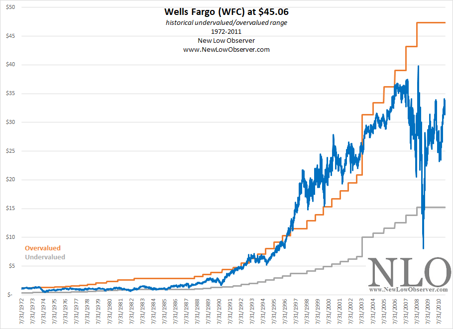 Our work on Wells Fargo excludes a great deal of information. We could not included the overvalued/undervalued range from 2011 to the present because the levels are so high that it doesn’t allow a clear perspective on the range from 1972 to 2011. This is an exception to most stocks that we run 10-year price targets as it is usually in line with Value Line Investment Survey estimates.