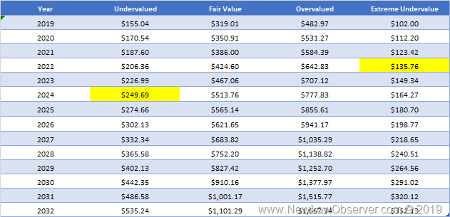 Below are the valuation targets for Wells Fargo (WFC) over the next 10 years.