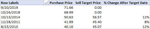 We’re assuming that no additional purchase is made for the stock and that the position is held at least one year. The “average” return jumps to +21% if held for a minimum of 2 years. This makes it worth considering a longer timeframe if a purchase is made at the current levels.