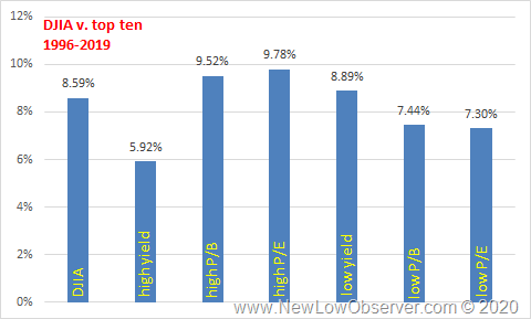 Keep in mind that the time frame for this assessment is one year. One might think that this is a one-time occurrence but our data, as confirmed in the Dogs of the Dow from 1996-2019, shows that companies with high P/E ratios tend to outperform the widely followed Dow Jones Industrial Average and S&P 500 Index.