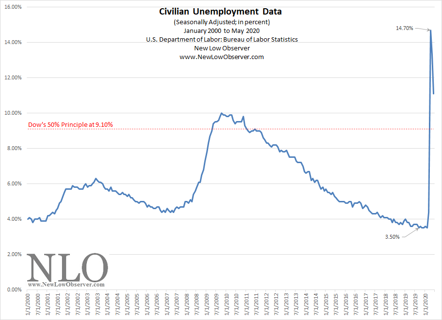 In this case, the most recent low in the unemployment rate was 3.50% and the recent peak (which could be adjusted) was 14.70%. This puts Dow’s 50% Principle at 9.10% as the most likely target to achieve.