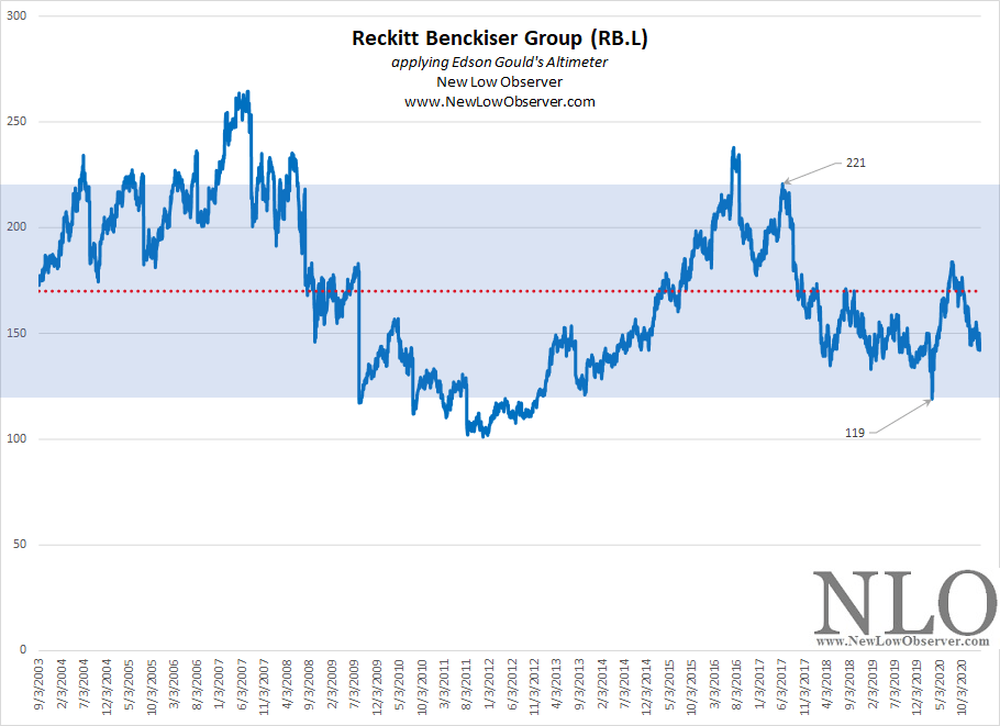 The valuation targets for Reckitt Benckiser Group (RB.L) are based on a dividend growth rate of 10% and applied to Edson Gould’s Altimeter. A graphical representation of the overvalued, fair value, and undervalued levels are below.