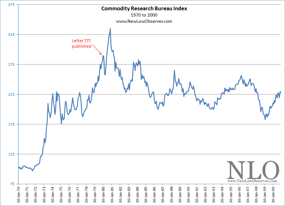 “One remarkable feature of today’s markets is the lackluster performance of most commodities. The ‘war babies,’ sugar, copper end cotton have made big moves but the grain complex and the meats are dead. With inflation roaring, this has come as a total shock to most commodity traders. Frankly, I have been wondering what the ‘tired’ grain and meat prices mean. Are they seeing something that we aren’t? (Russell, Richard. Dow Theory Letters. Letter 777. February 27, 1980. page 5.).”