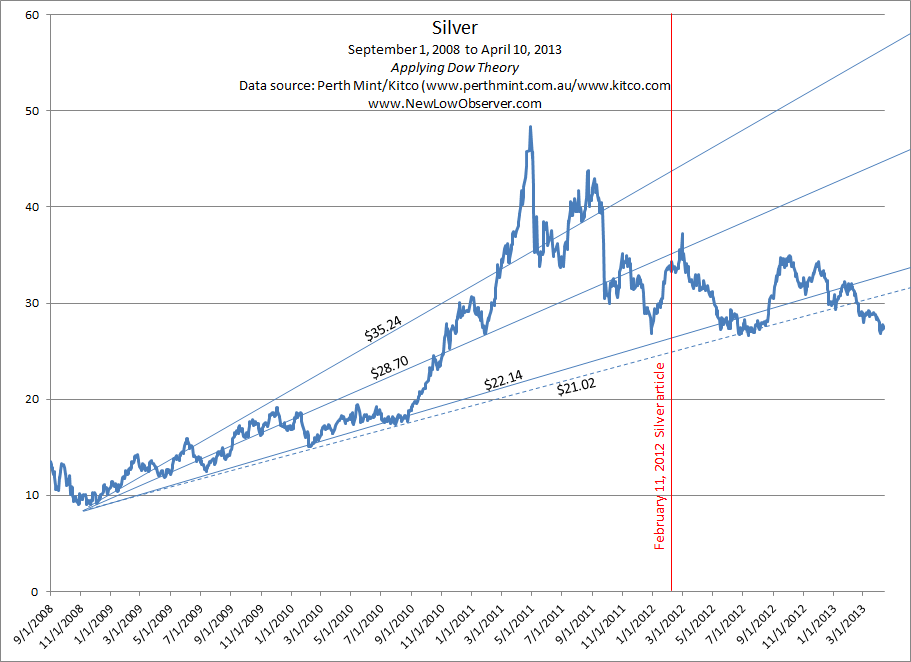 As seen in the chart below, Silver has declined to the rising support level of $21.02 in many instances but broke through to the downside on February 18, 2013.