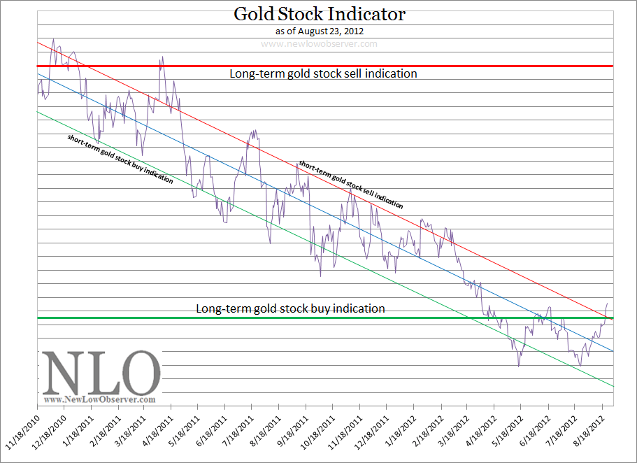 As can be seen in the chart of our Gold Stock Indicator, the long-term buy indication has been triggered with the added bonus of a significant double-bottom on May 15th and July 23rd. This suggests that the long-term trend in the price for the Philadelphia Gold and Silver Stock Index (XAU) is up. However, as with any trend up or down, there are going to be counter-trend moves. Already, there have been five buy signals for gold stocks even though the overall trend has been down since November 2010.