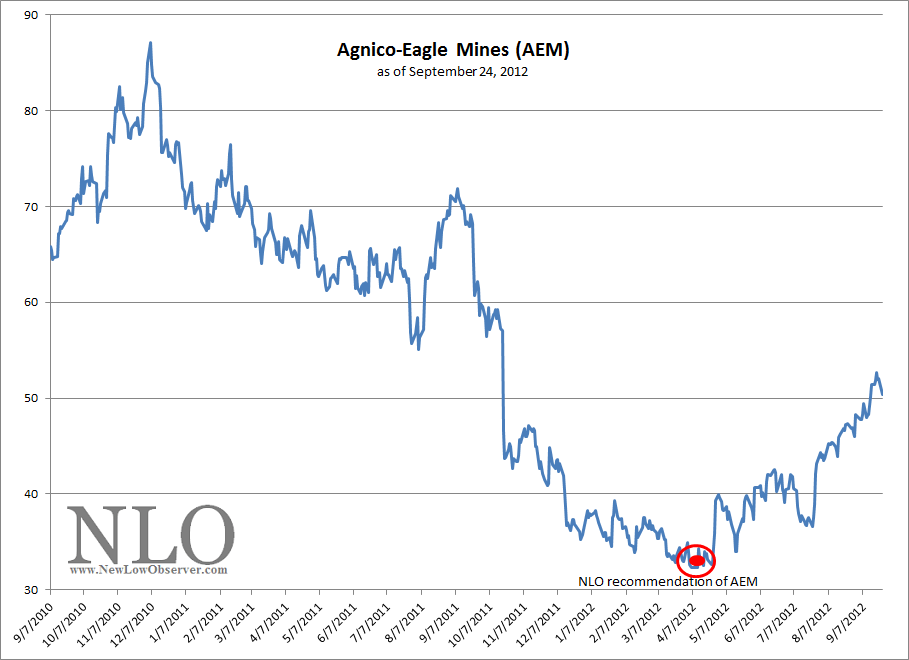 On April 6, 2012, we recommended the consideration of Agnico-Eagle Mines (AEM) (found here). On September 25, 2012, we recommended selling of AEM (found here). While we got a lot of heat from readers of the SELL recommendation, from the less than brilliant to the reasonably rational, our work has proven that precious metal bull markets are vicious and should not be taken lightly.